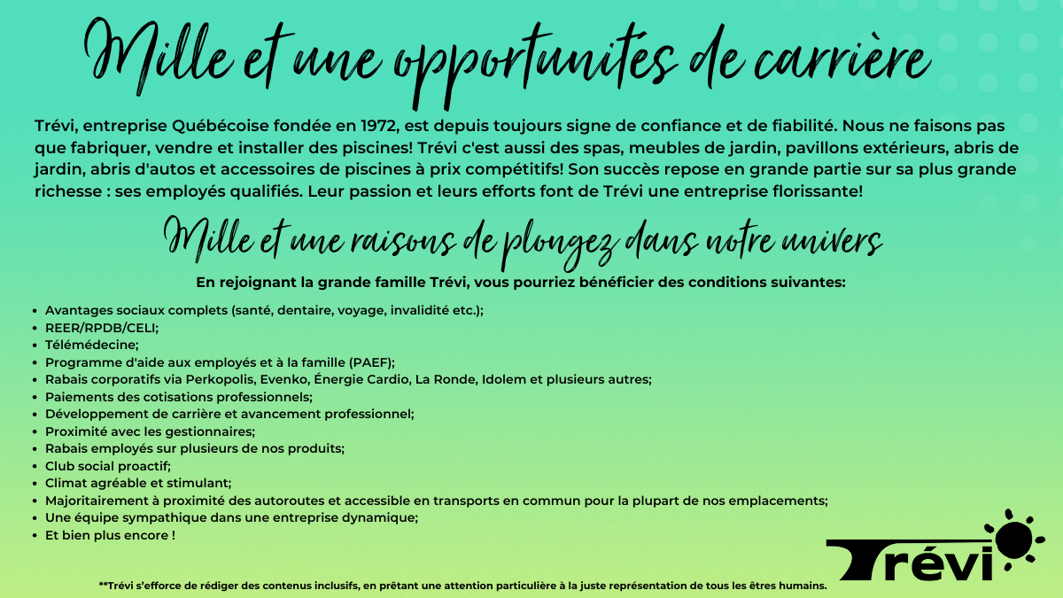 Nous sommes présentement à la recherche de Représentant(e) des ventes pour nos différents départements (piscines hors terre, creusées, spas, accessoires et meubles de jardin)